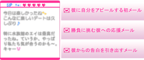 夜中のメールはおそらく、サプライズ的な意味合いがあるのでしょう。いきなりメールして●●●さんをドキッとさせたいとか、また■■■さん、自身もちょっぴり人恋しいよう。こんな場合は「メールくれて嬉しい」と、喜んであげちゃってください。●●●さんが喜べば彼も嬉しいハズ。ただし自分のモテ加減を確かめたいだけの場合もあるので、言葉を額面通りに受け取るのは少々危険。彼の気持ちを引き出すために恋愛のジャブを繰り出しつつ、一方で様子を見る冷静さも必要かもしれませんよ〜。